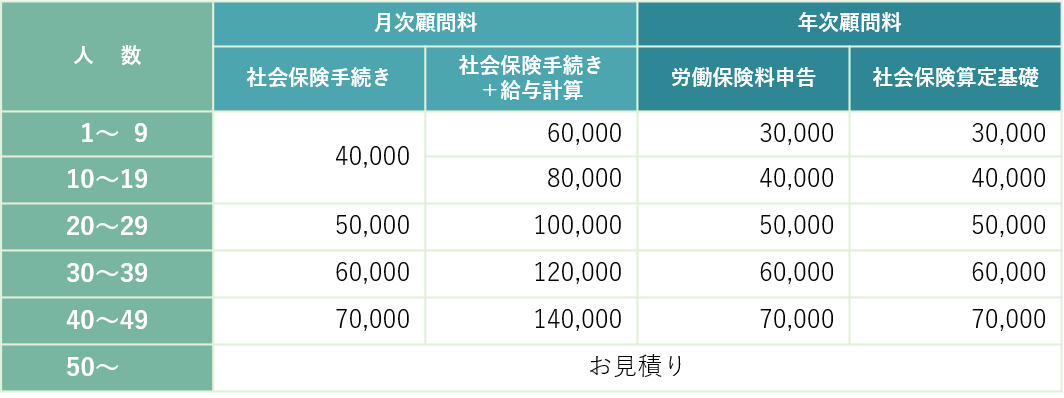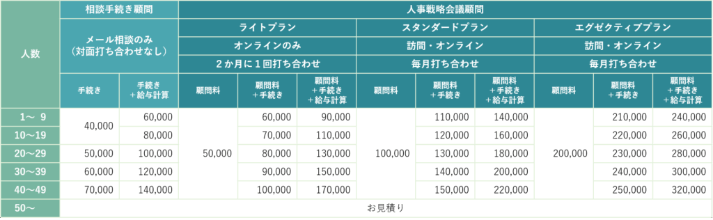 ・当事務所における顧問料は下記内容を基本としておりますが、受託範囲、契約形態などを考慮し、お客様のご要望に合わせてお見積りいたしますので、お気軽にご相談ください。